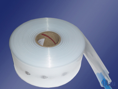 auf Rolle aus transparentem Hochdruck-Polyethylen, mit Recycling-Symbol.